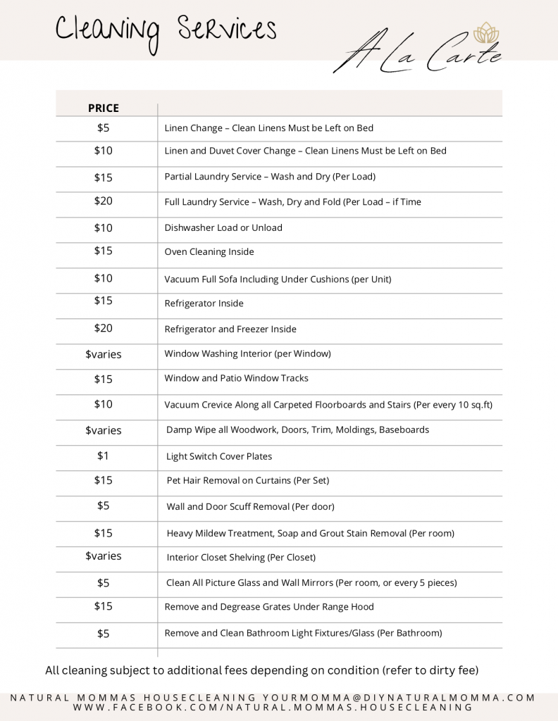 Leave Your Dust To Us We Cover All Your NeedsIf you don't see what you need, give us a call or email and we will work on options for you! We also offer a la carte services that can be added to any cleaning, or as a stand alone service with a $30 per hour minimum.